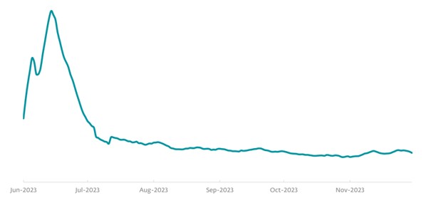 Imaginea 5. Trendul detecțiilor Android/SpinOK în a doua jumătate a anului 2023, media mobilă pe șapte zile