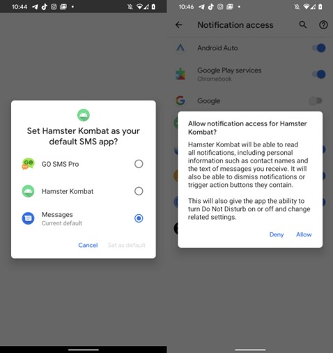 Prima amenințare este o aplicație falsă, nefuncțională, malițioasă, care imită aplicația Hamster Kombat și conține spyware-ul Android Ratel, capabil să sustragă notificările și să trimită mesaje SMS. Operatorii malware folosesc aceste funcționalități pentru a plăti abonamente și servicii cu fondurile victimei, fără ca aceasta să observe.