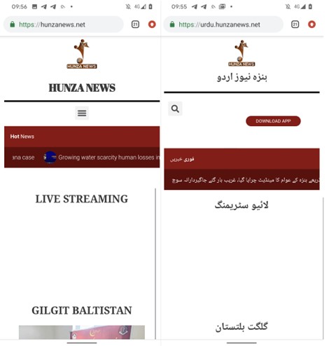 Imaginea 7. Versiunile în limba engleză (stânga) și în limba urdu (dreapta) ale Hunza News, afișate pe un dispozitiv mobil